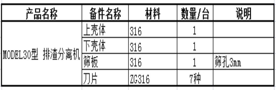 產(chǎn)品名稱:?MODEL3O型 排渣分離機卜 備件名稱:?上殼體?下殼體?篩板?刀片